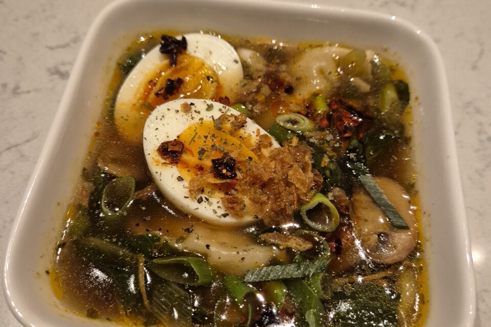 Voeg de paksoi, gyoza’s, peen julienne en bosui toe en laat alles nog een minuut of 10 meekoken, zodat de gyoza’s gaar zijn. Kook ondertussen de eieren, ongeveer 6 minuten. Pel ze en halveer deze.